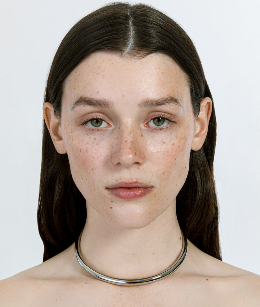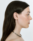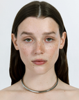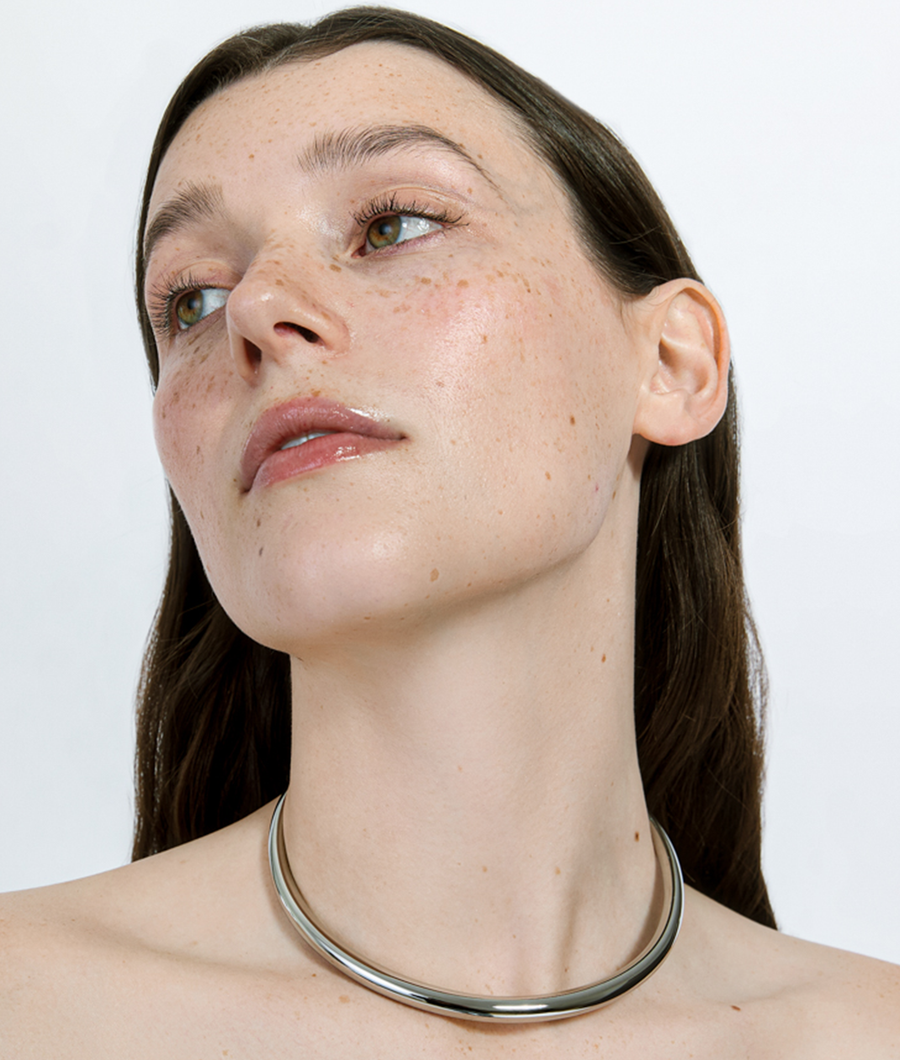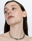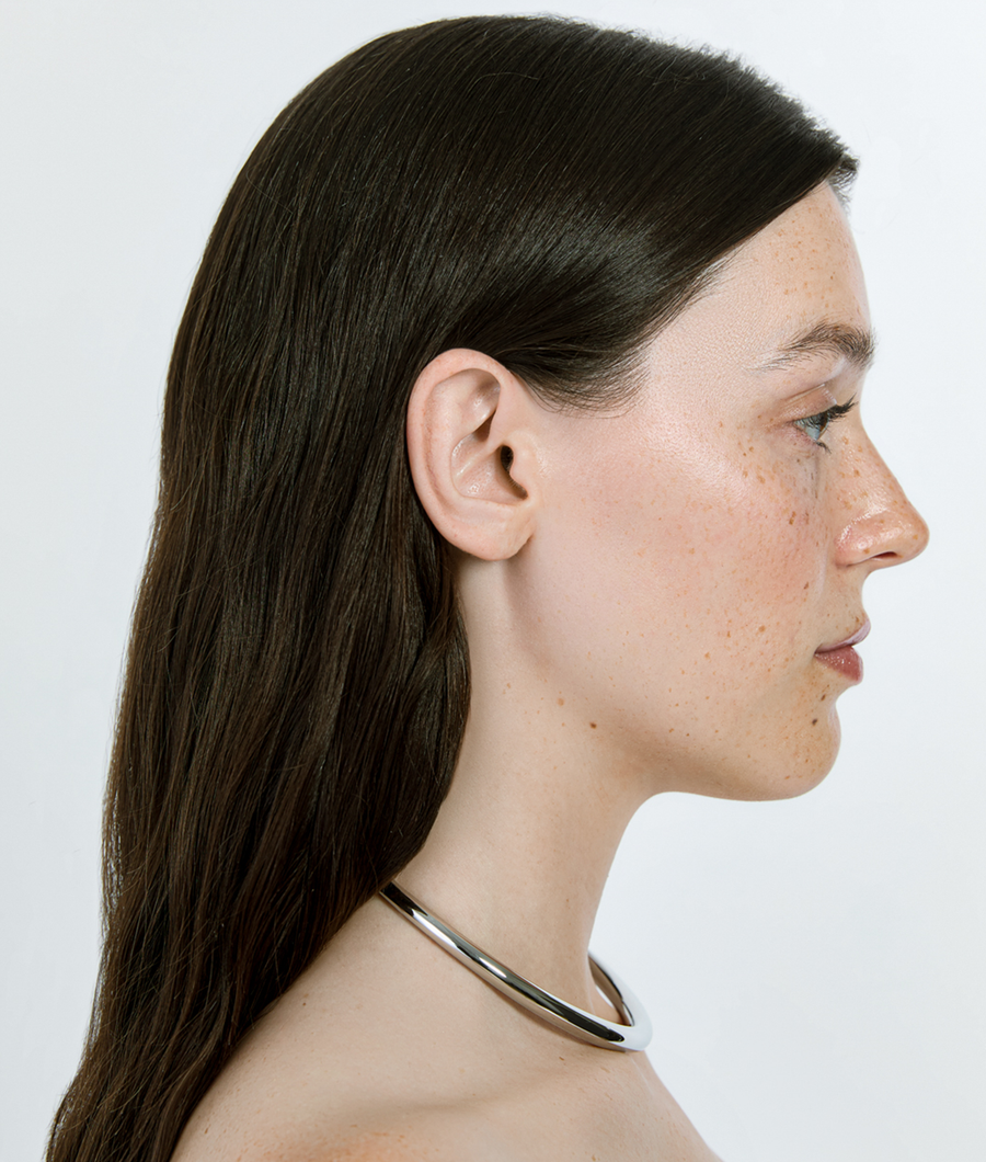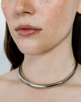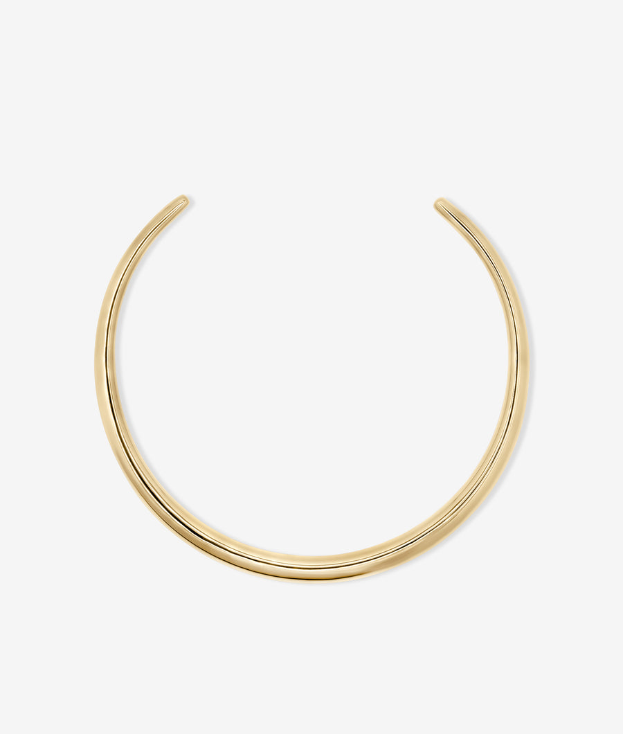 Clean lines meet confident form in the Dominique Necklace Cuff. Sculpted in a fluid arc with a seamless finish, this collar-style piece delivers bold minimalism—perfect as a standalone statement or layered with fine chains for contrast.