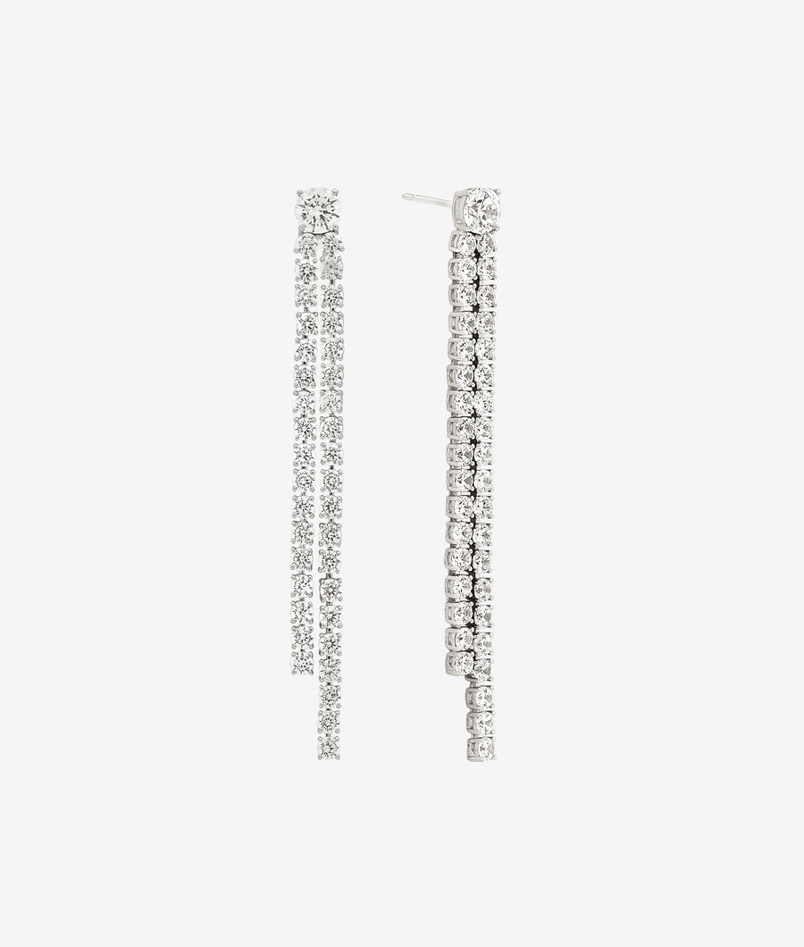 Striking in its simplicity, this elongated drop silhouette is composed of precision-set stones that catch the light with every movement. Anchored by a solitaire stud and finished with cascading rows of brilliance, it delivers clean glamour with a fluid, modern edge.